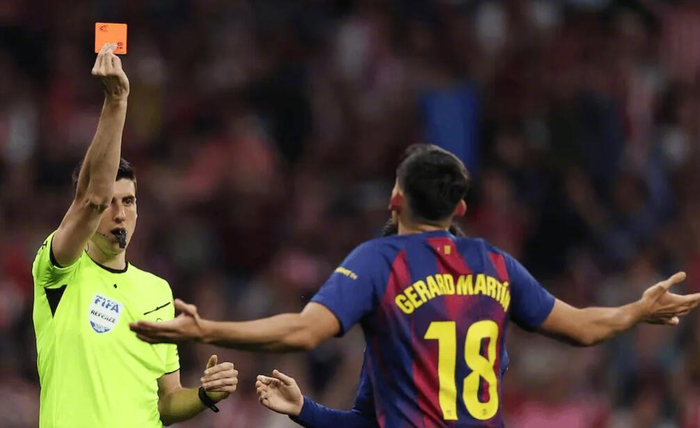 近日,在马竞对阵巴萨的比赛中,围绕杰拉德-马丁的一次争议判罚引发广泛讨论。这次原本出示红牌的动作,在VAR介入后被改判为黄牌,不仅引起马德里竞技方面不满,皇马TV也对这一判罚进行了强烈质疑。